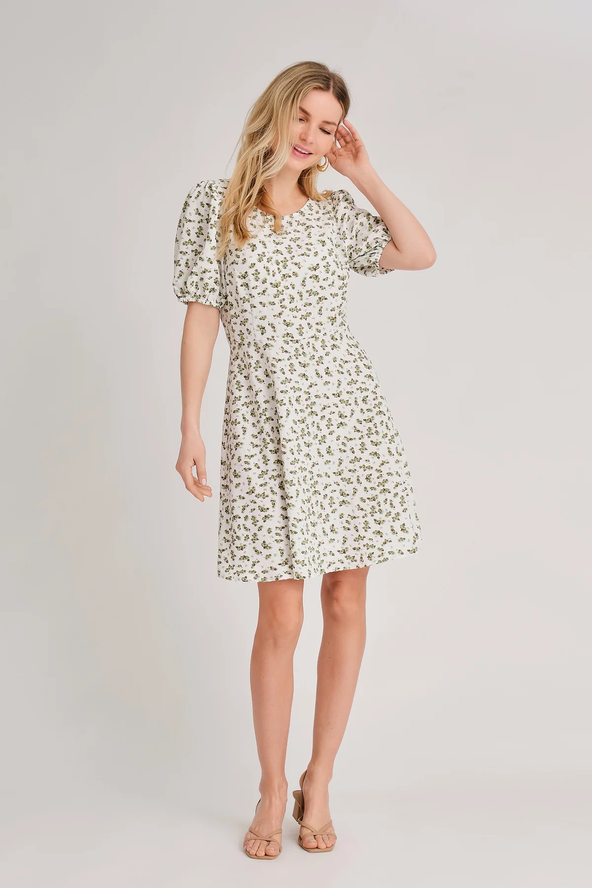 Kjolen har korte ermer med puffeffekt, strikk i kanten, rund hals og svakt innsvingt midje.
