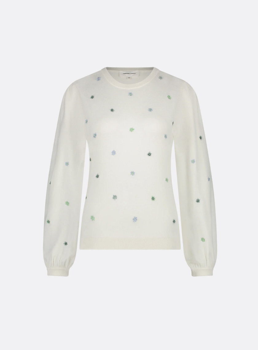 Lekker genser i kremhvit med søte små broderte blomstertrykk over hele.