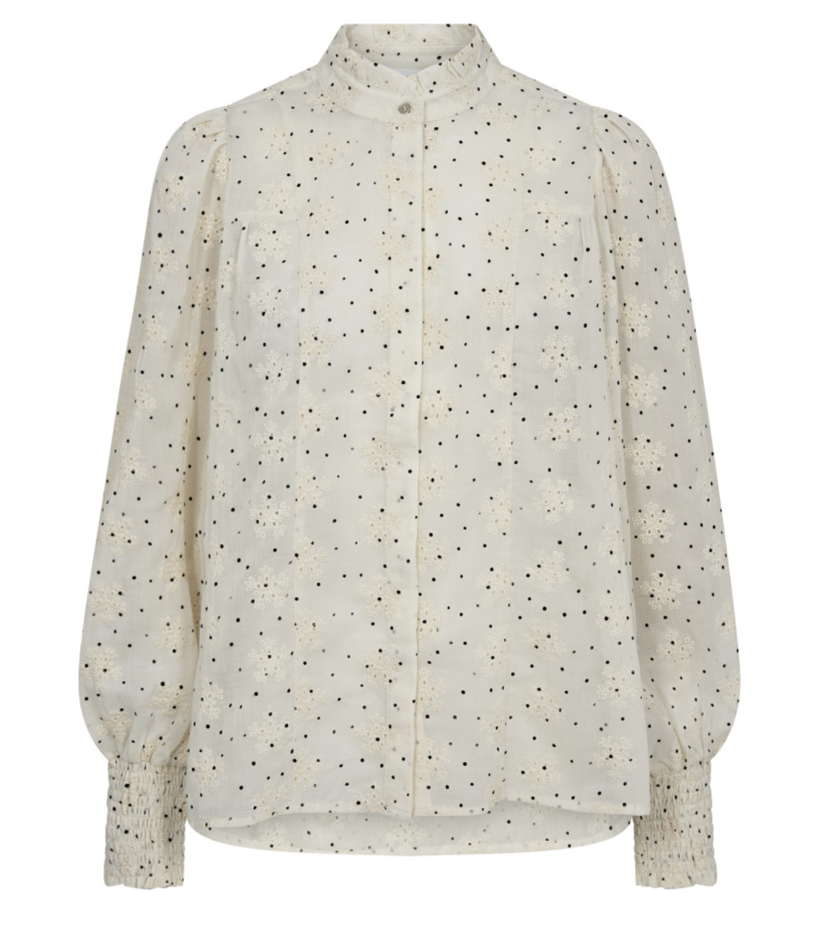Skjorten er designet med en noe løs til normal passform, lange voluminøse ermer med elastiske mansjetter.