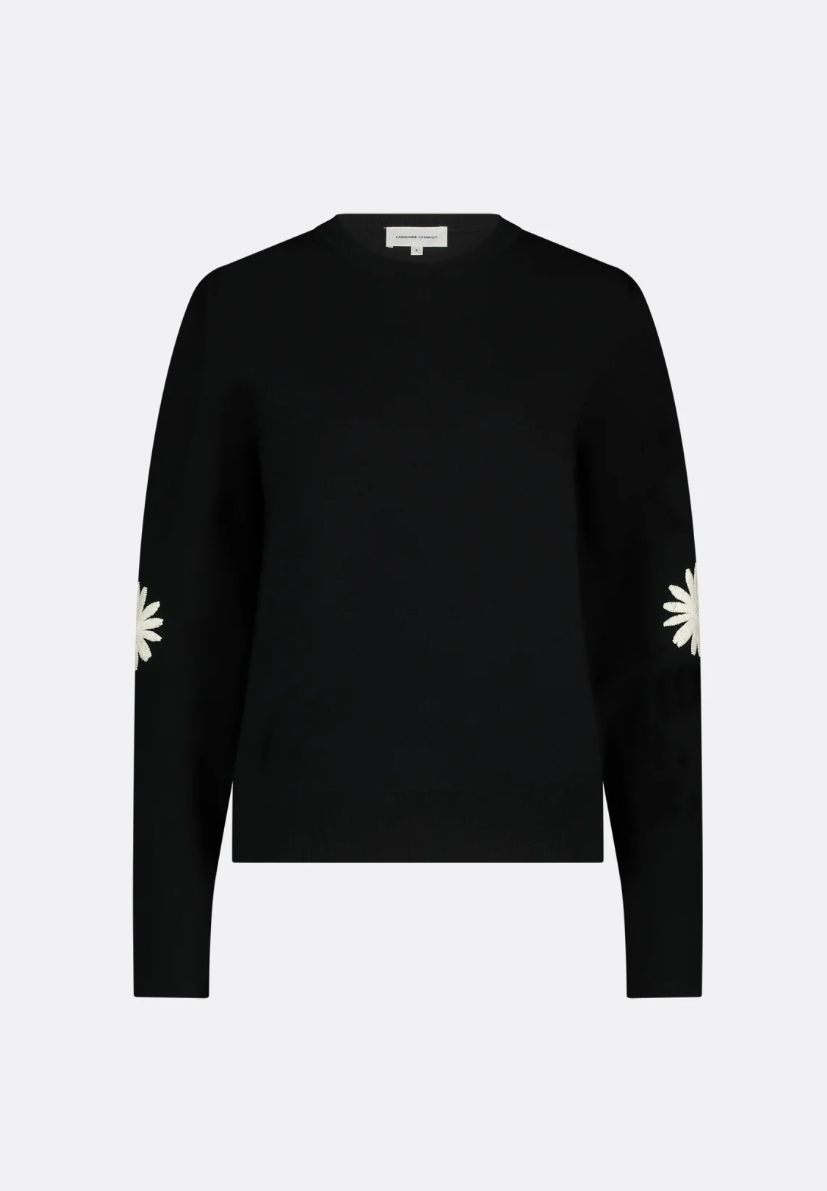 Tøff genser med broderte hvite blomster på ermene.