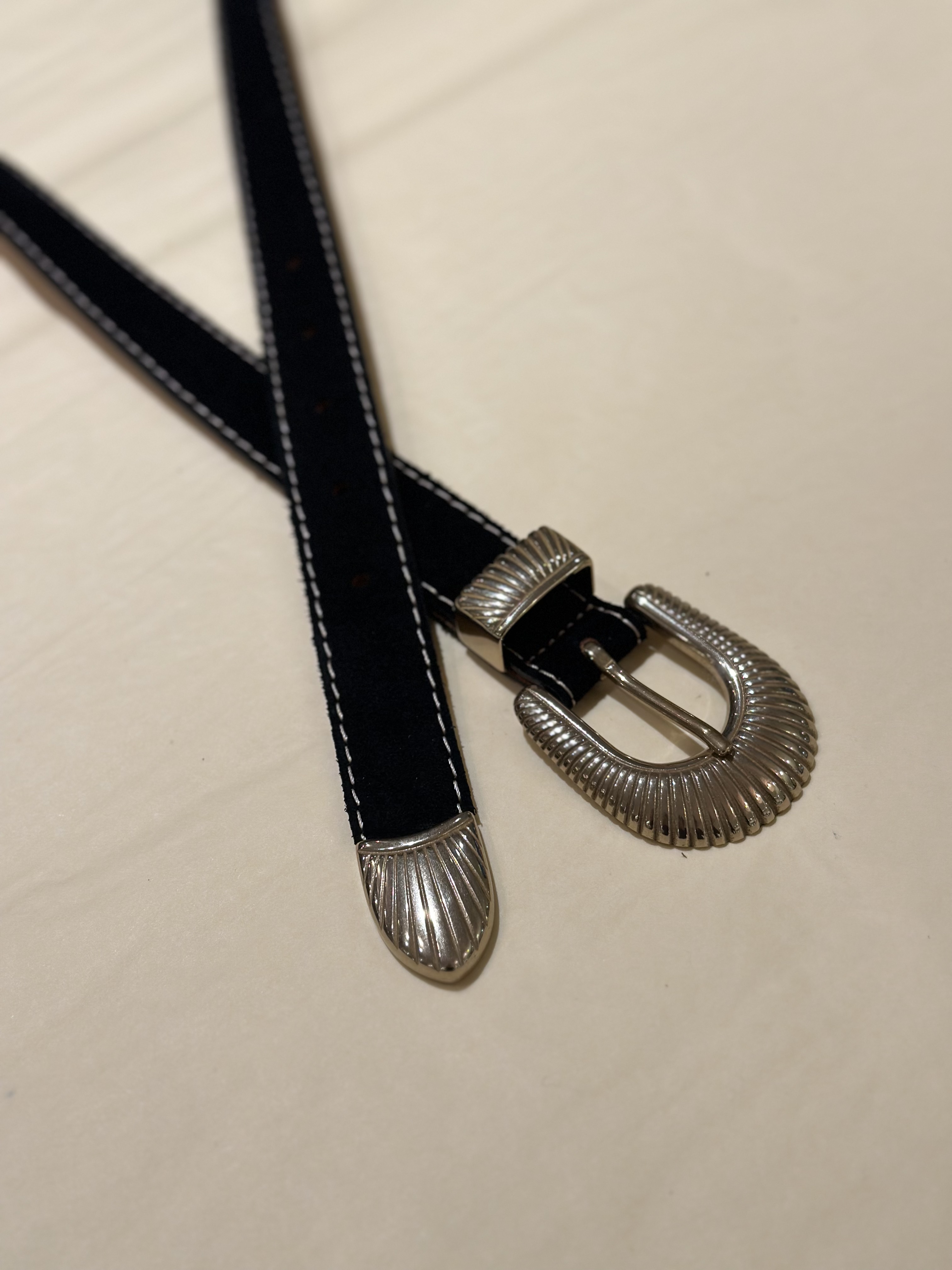 Beltet er utsmykket med en elegant, vestlig-inspirert spenne i polert metall.