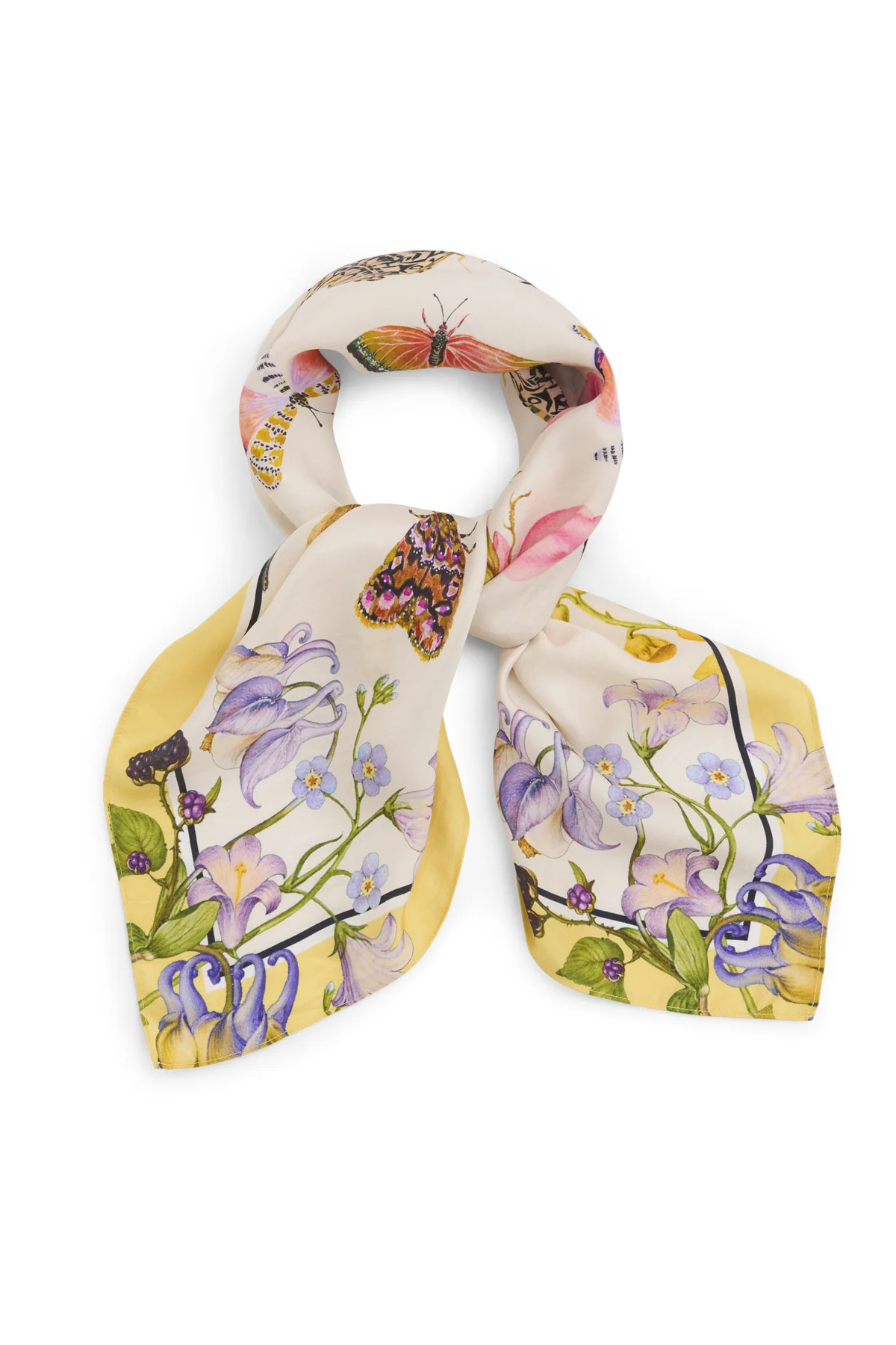 Løft garderoben din med med dette utrolige skjerfet som prydes av nydelige sommerfugler og blomster innrammet av en lys gul kant som gir en freshet til antrekket.