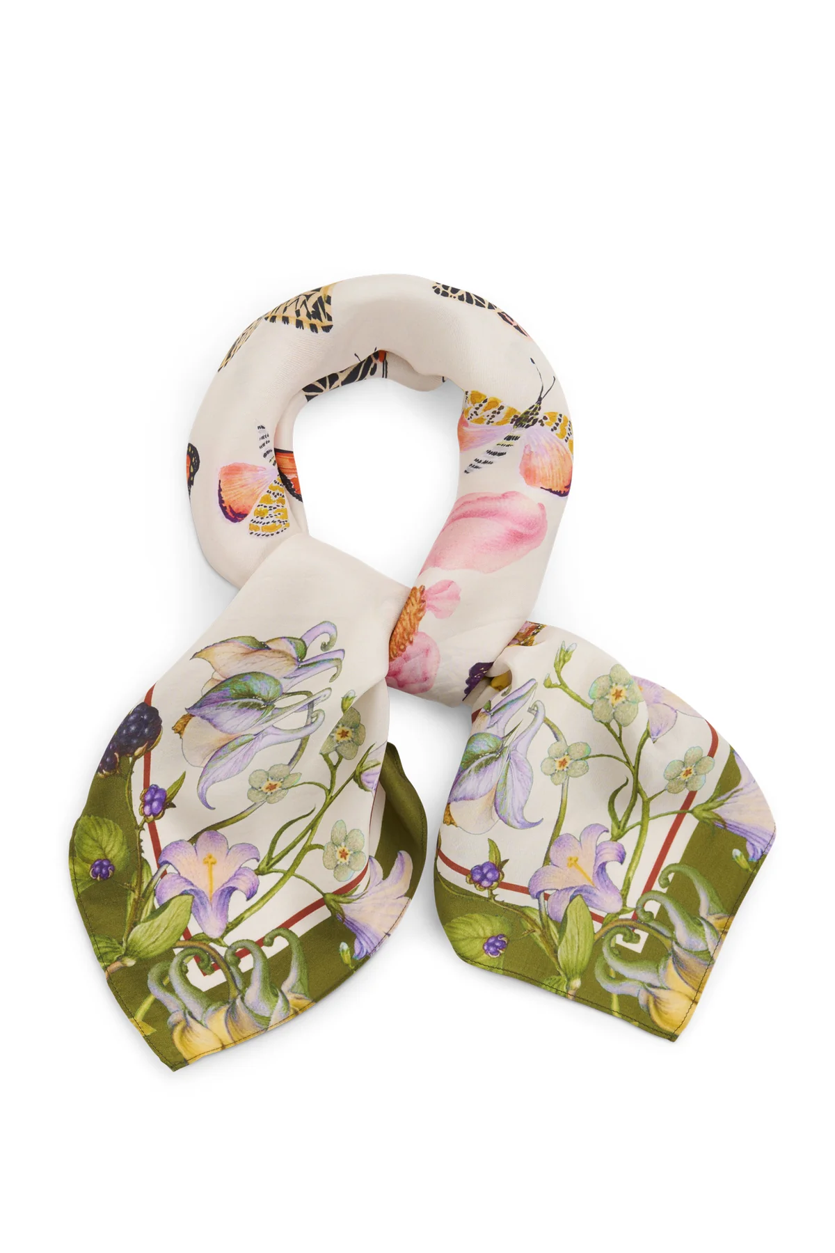 Serenity Green Silk scarf - vakkert skjerf i 100% førstklasses silke med sommerfugler og blomsterprint.