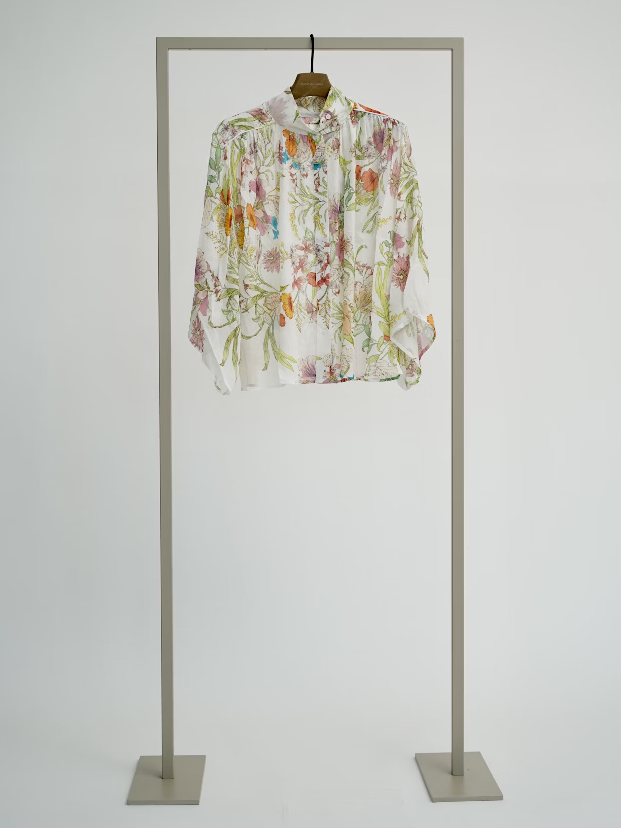 Lekker slkebluse med blomstertrykk og ståkrage.