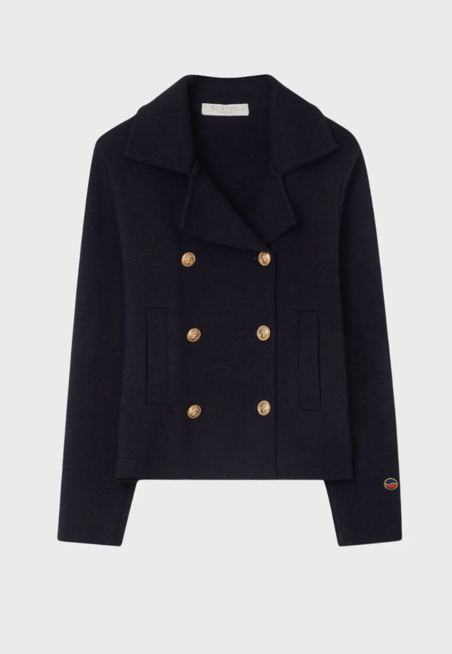 Jakken er designet med kort snitt, dekorative detaljer med seks gylne ankerknapper, og to sidelommer.