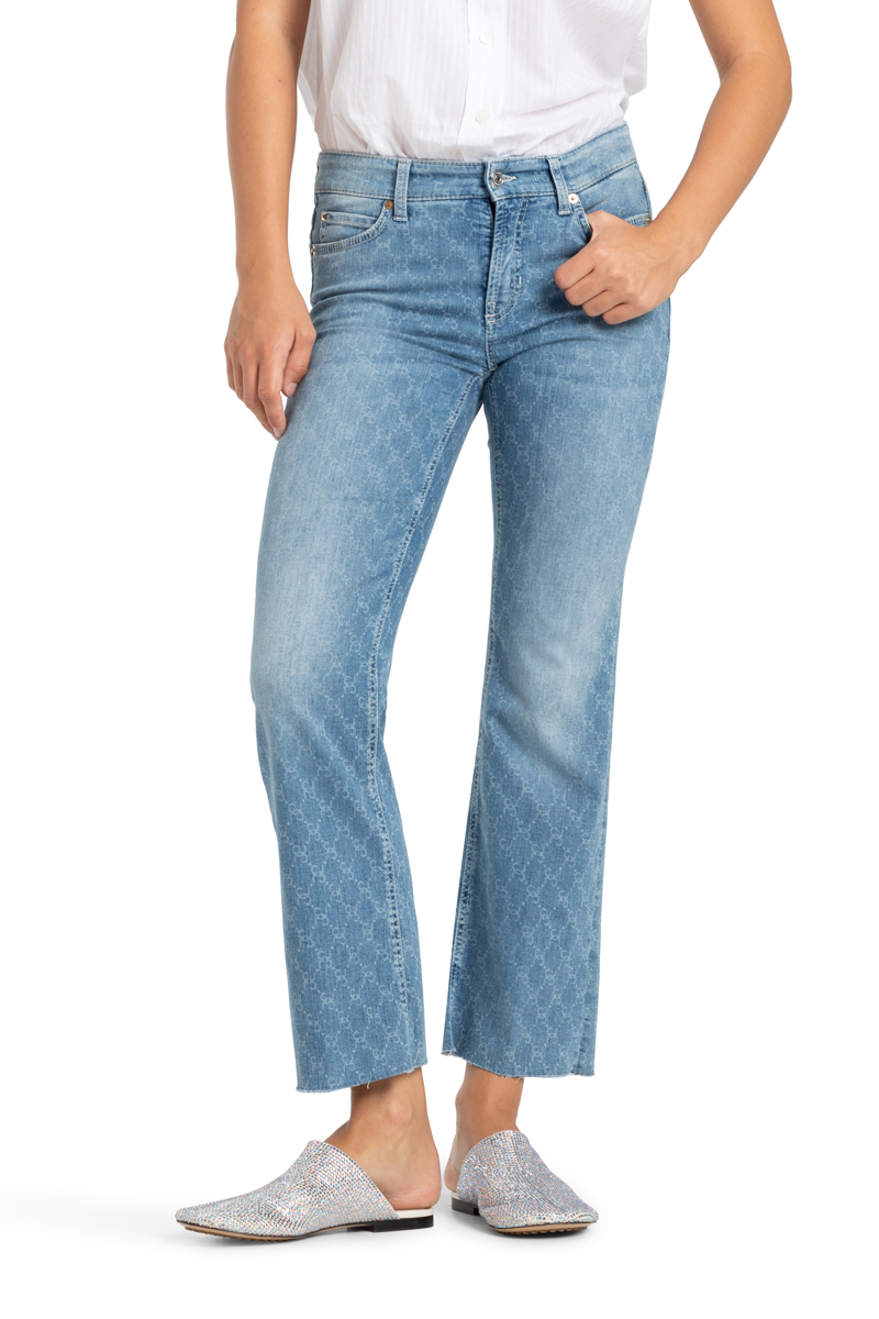 Paris Easy Kick denim jeans med mønster fra Cambio. Super stretchy og myk lys jeans med middels høyt liv med beltehemper, hvit skinnlapp med en liten nagle bak. Buksen er en liten kortere ankelmodell.
