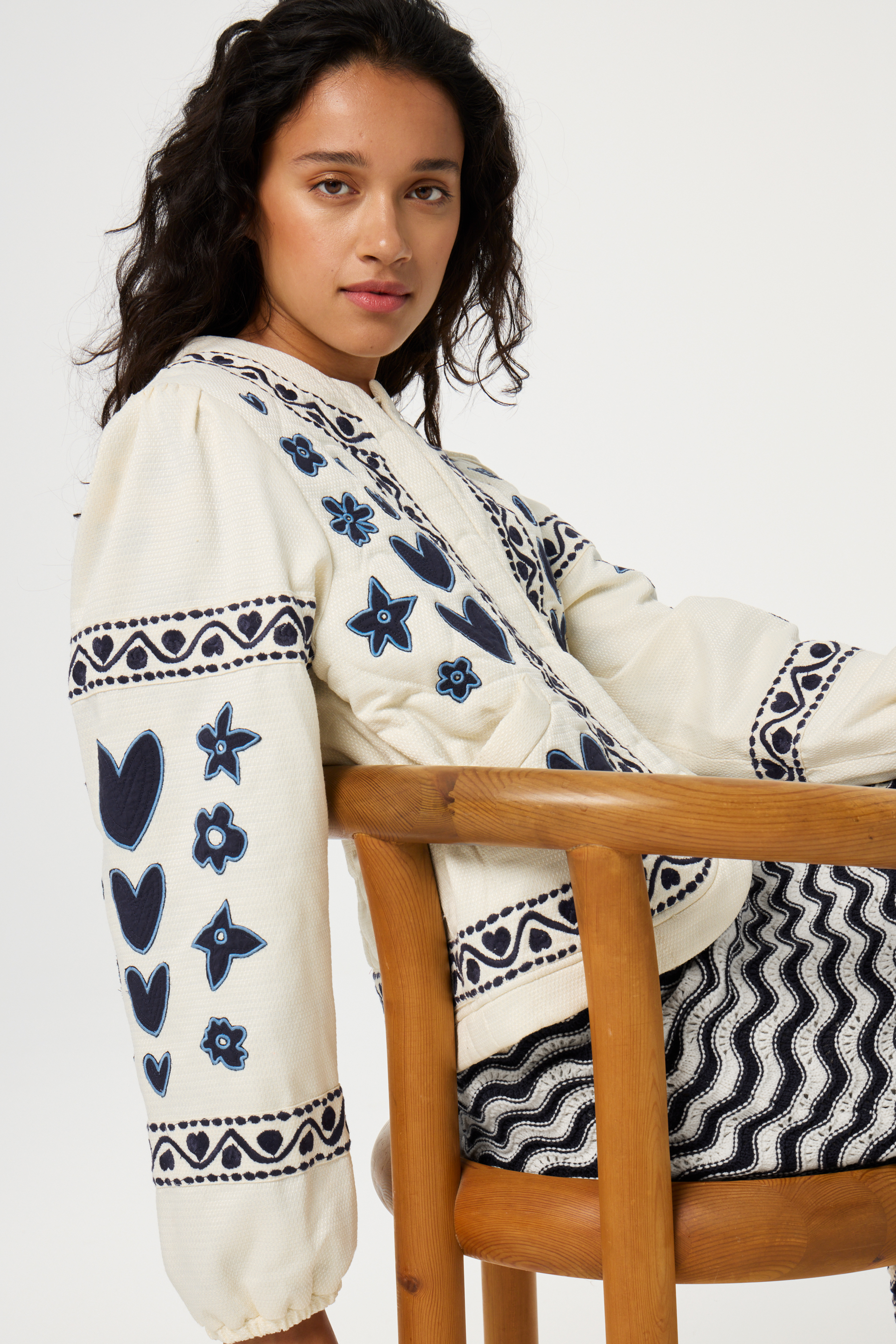 Super fresh jakke med hekteknapper og lekkert mønster i blått som gir en fin kontrast til den lyse bakgrunnen.