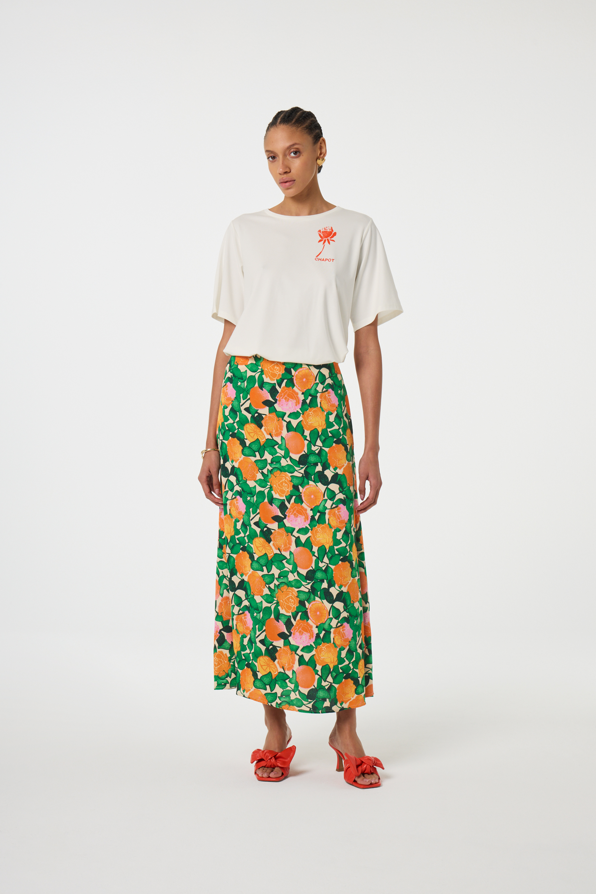 Herlig midi-skjørt med et all-over blomstertrykk og blind sideglidelås. Det ultimate skjørtet for å gi garderoben litt liv og farger.