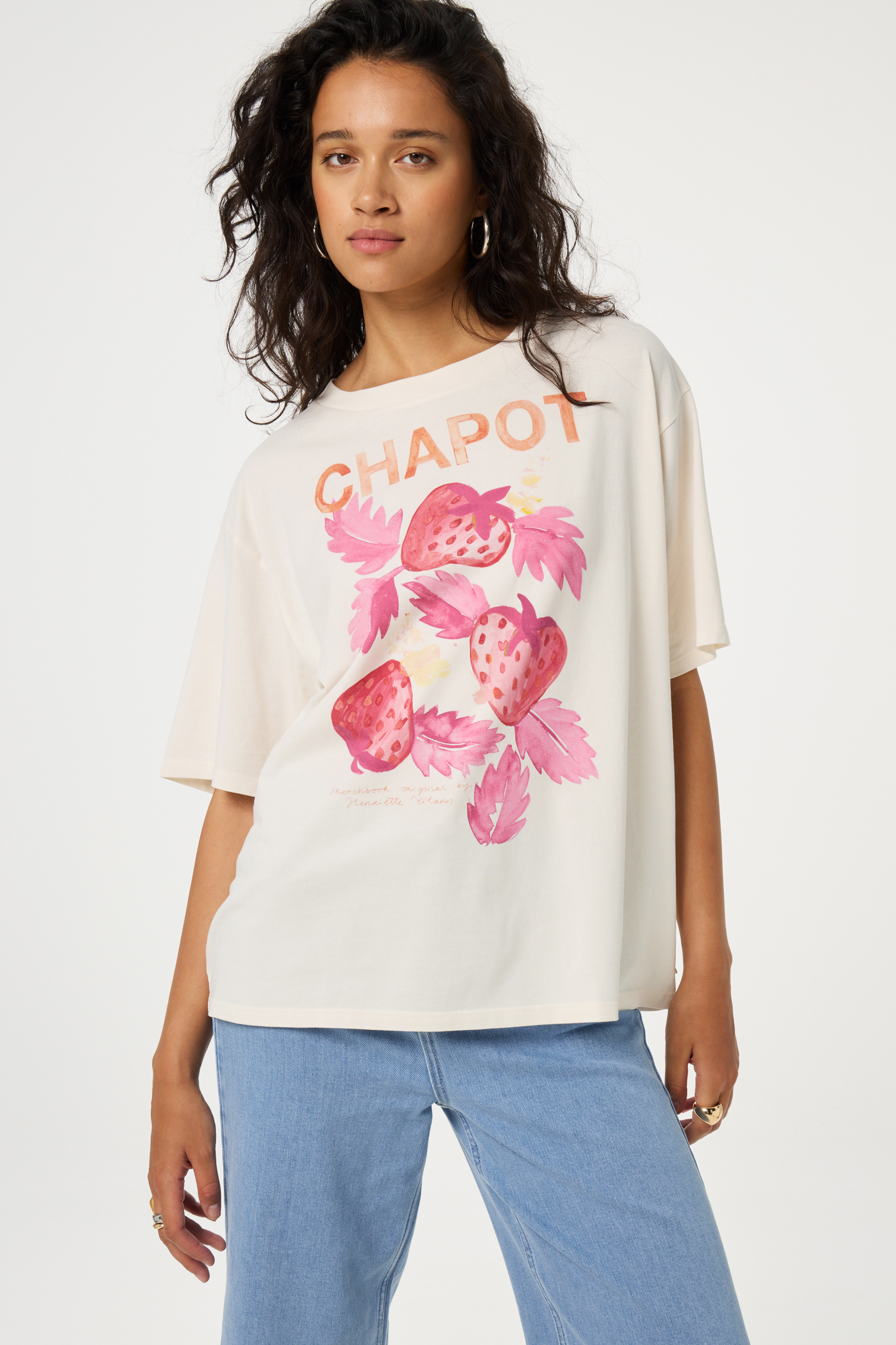 Denne kortermede t-skjorten er en oversized t-skjorte i off-white med trykk foran. T-skjorten har rund hals og er laget av 100% økologisk bomull.