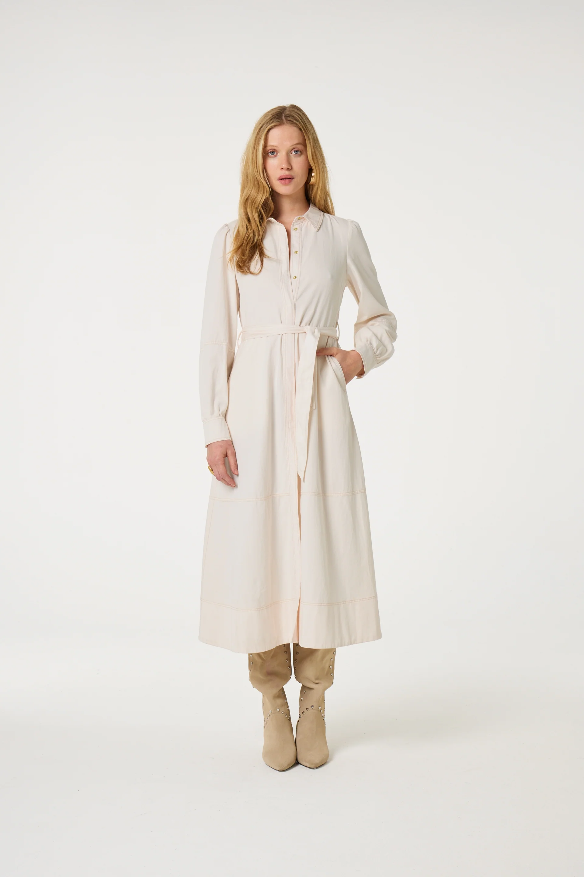 Herlig denimkjole i hvitt med en klassisk krage, lange ermer, en lang lengde og et knytebelte. En feminin kjole perfekt for å ha på seg dag og/eller natt.
