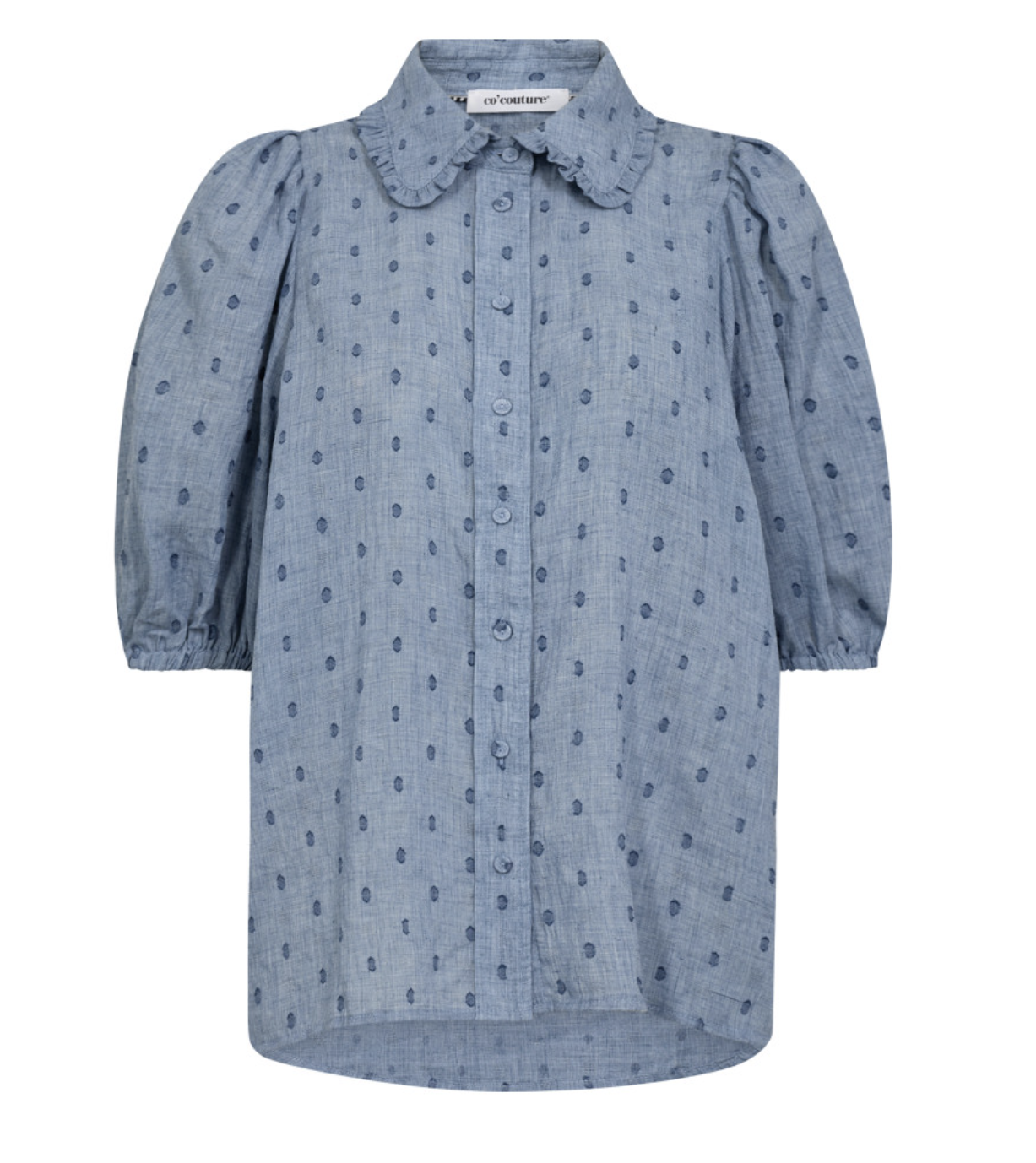 Blusen har krage i halsen med små volanger på, knappelukking i front og korte ermer med puff.