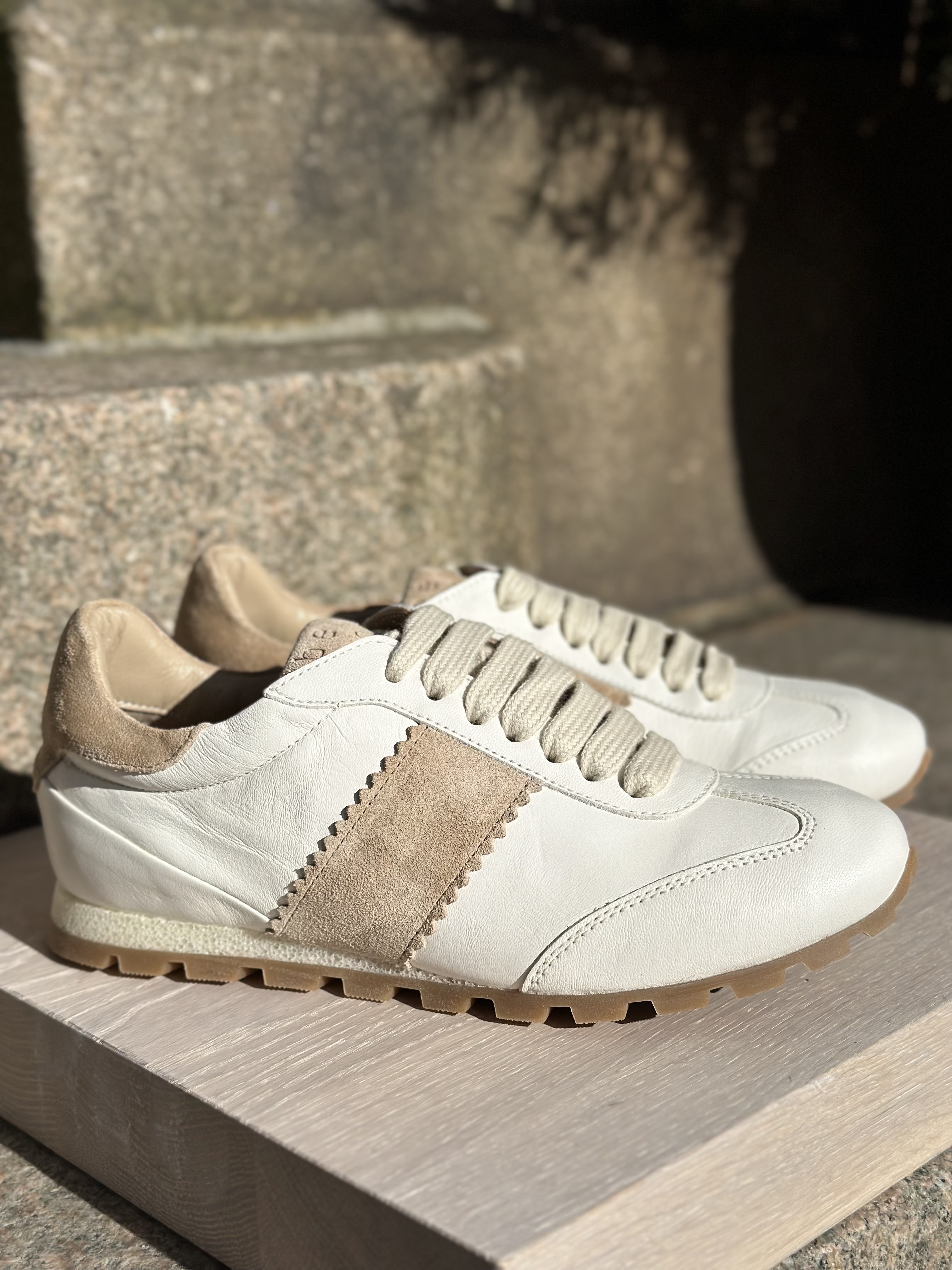 På sidene og bak på hælen finner man suede detaljer som gir en mer røff touch.