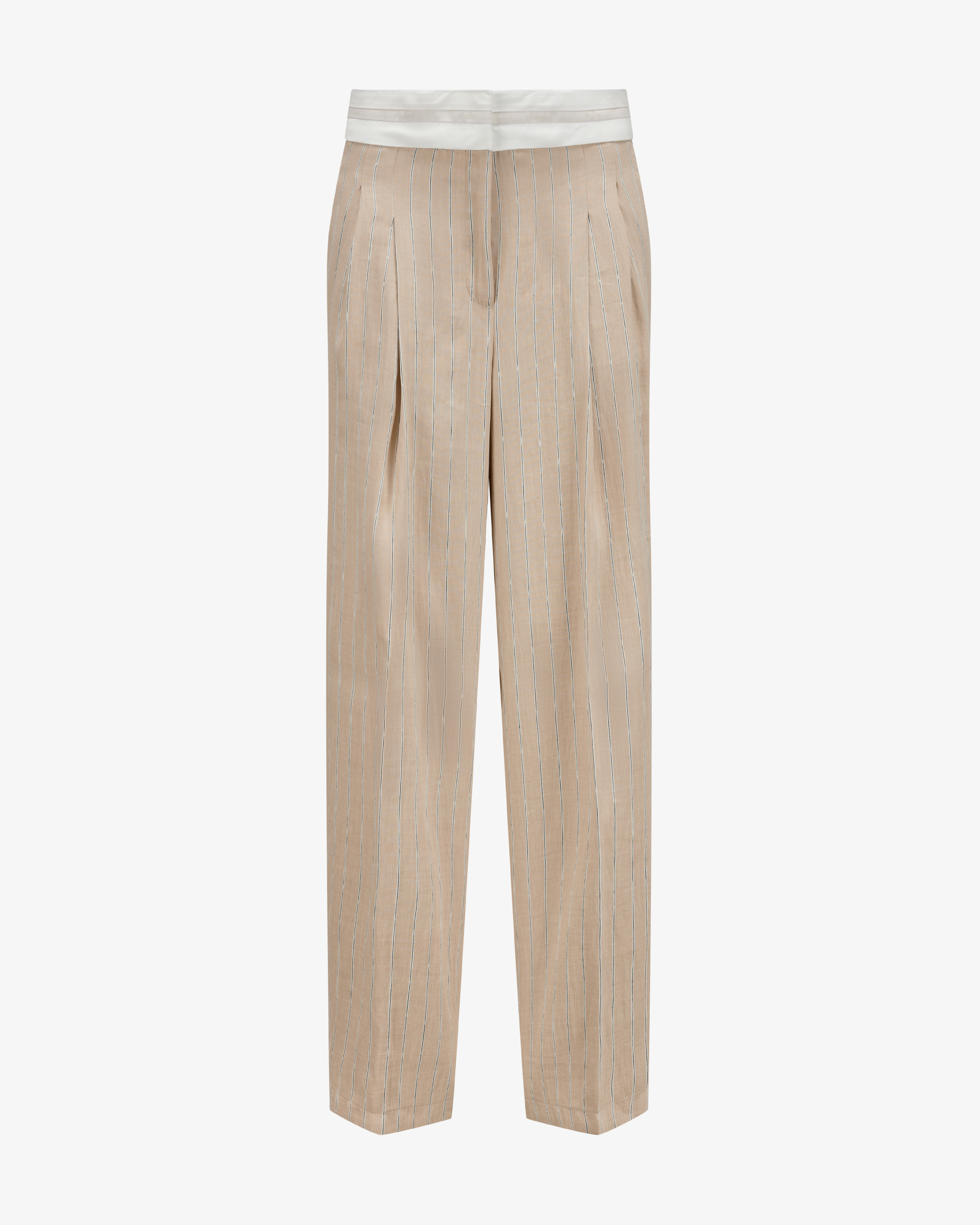 Buksene har vide bein og er laget av et pustende stoff i beige tone, med innslag av navy striper.