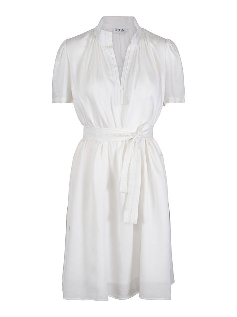 Kjolen har V- hals, knytebelte og med lekre blondedetaljer på belte og hals.