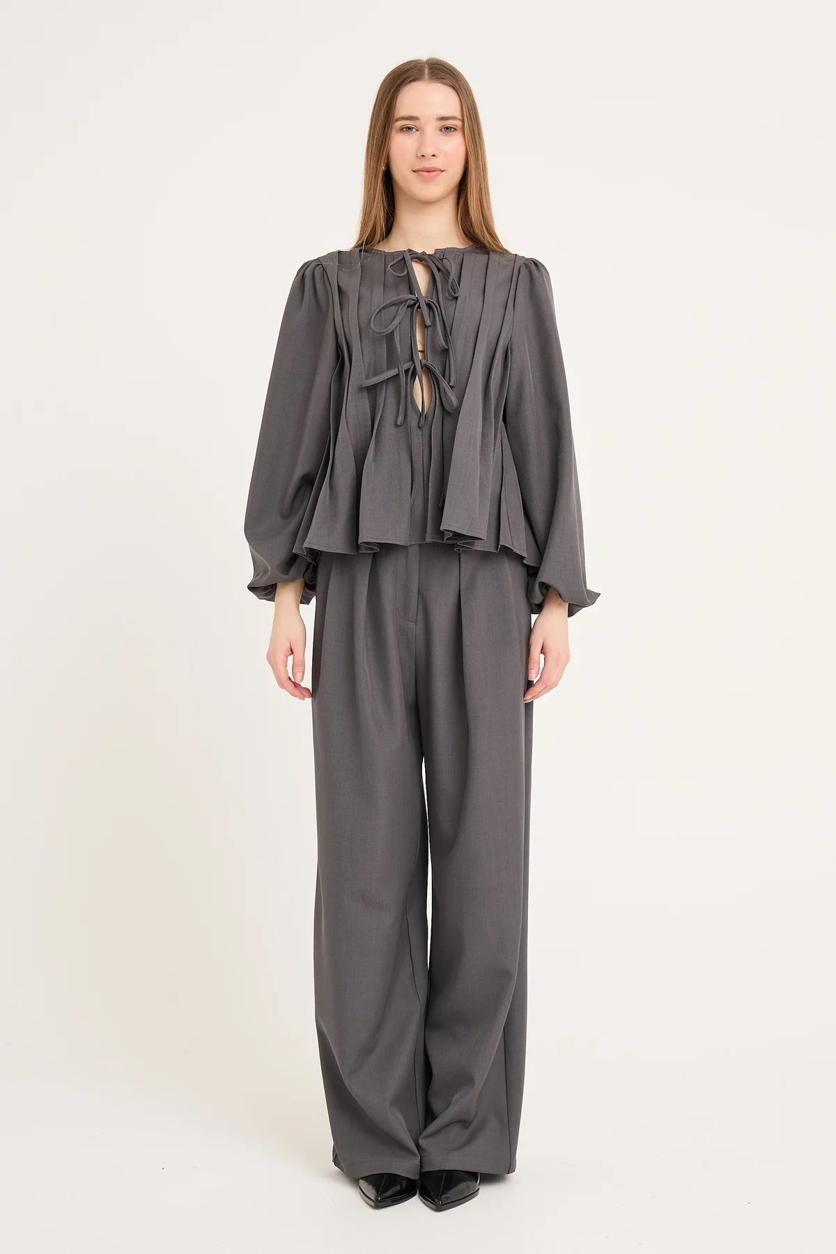 Den har lange, voluminøse ermer som avsluttes med strikk og en løs, feminin passform.
