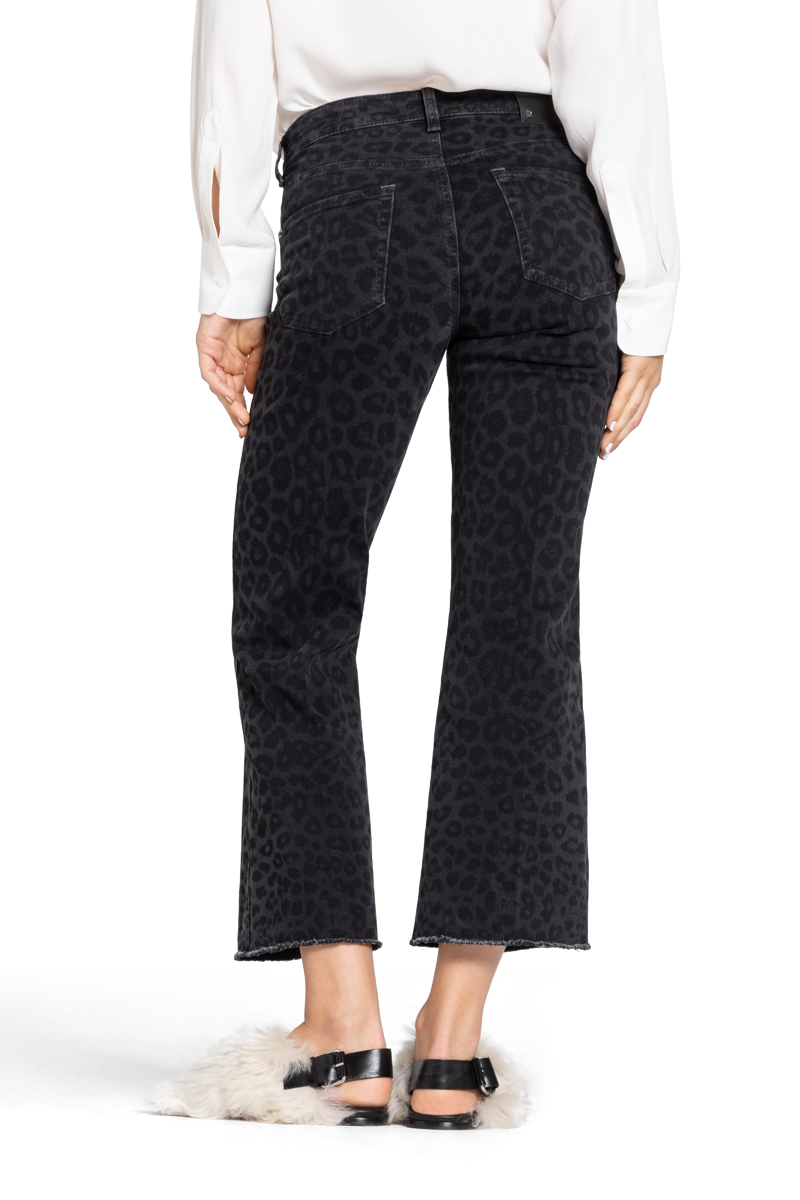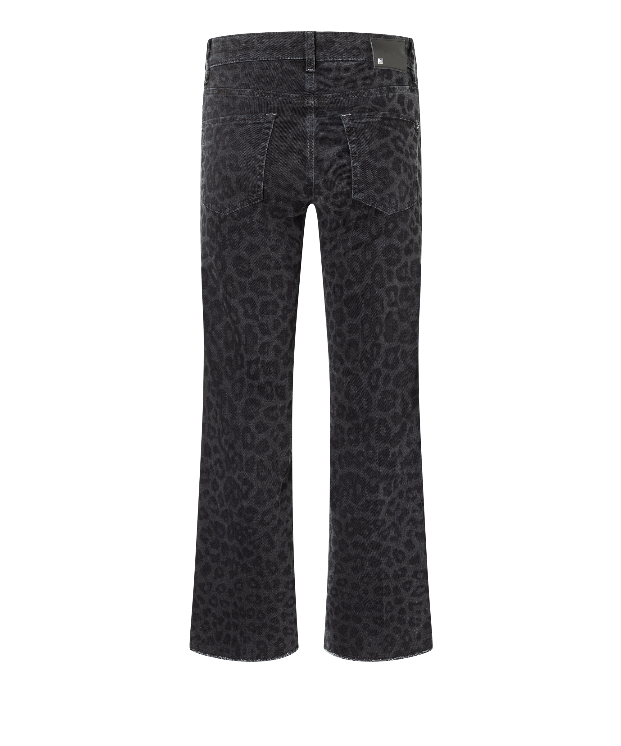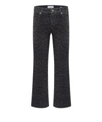 Fin 5-lommers jeans med svakt leopard mønster ton i ton og en liten kickflare med frynser på nederste kant.