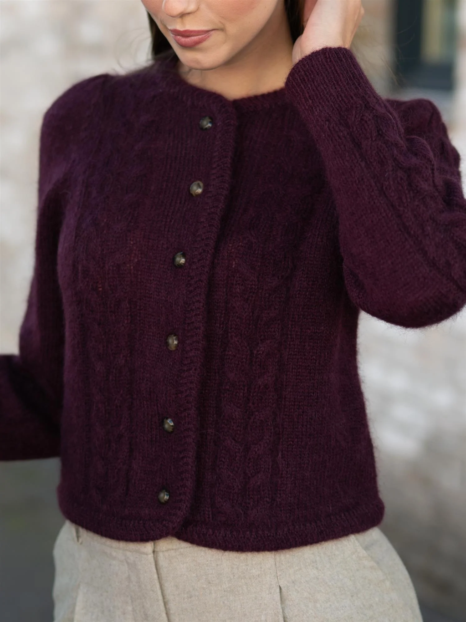 Nydelig plommefarget, tidløs og feminin cardigan.