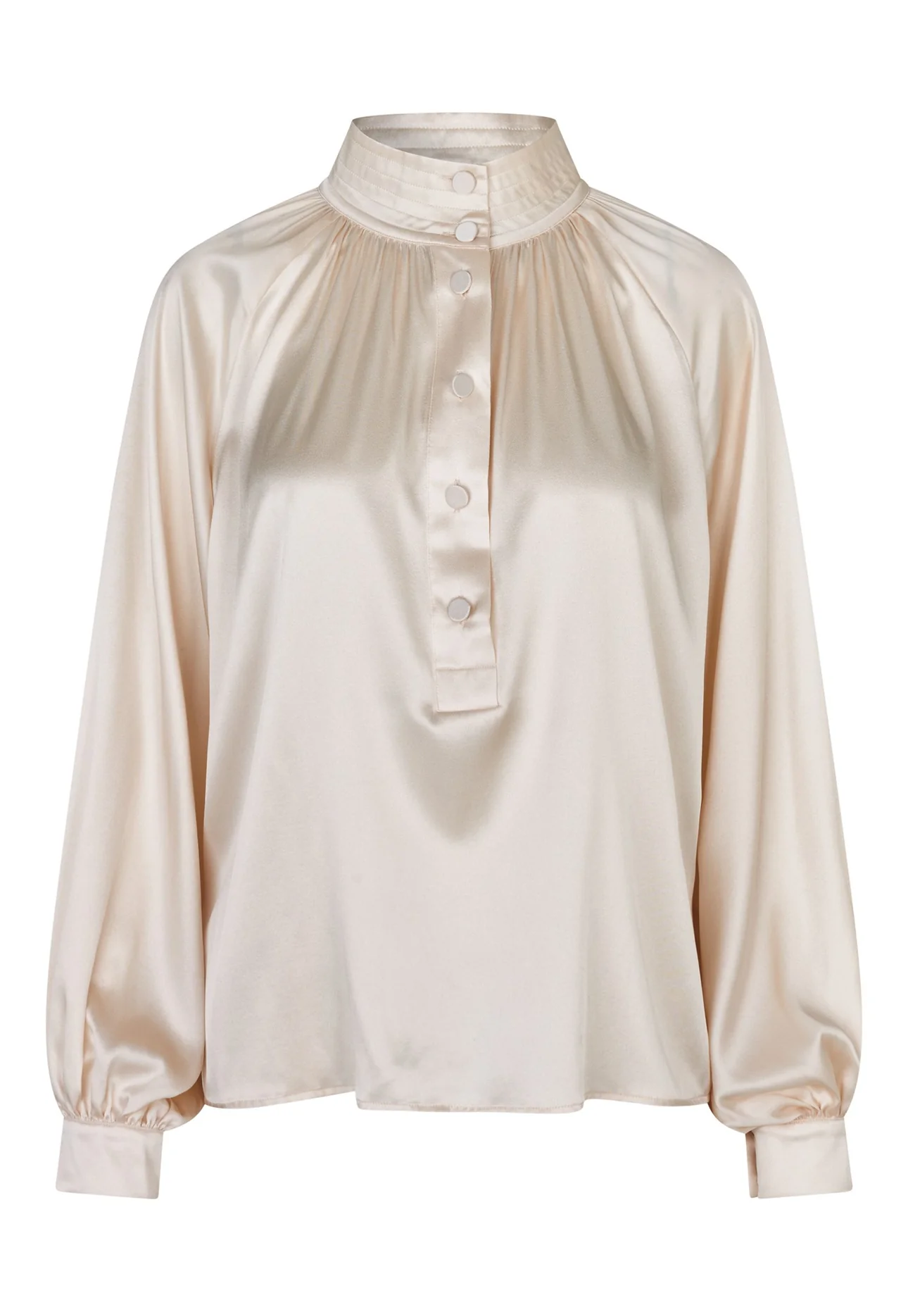 Lekker bluse med flere sømmer som går rundt den høye kragen.