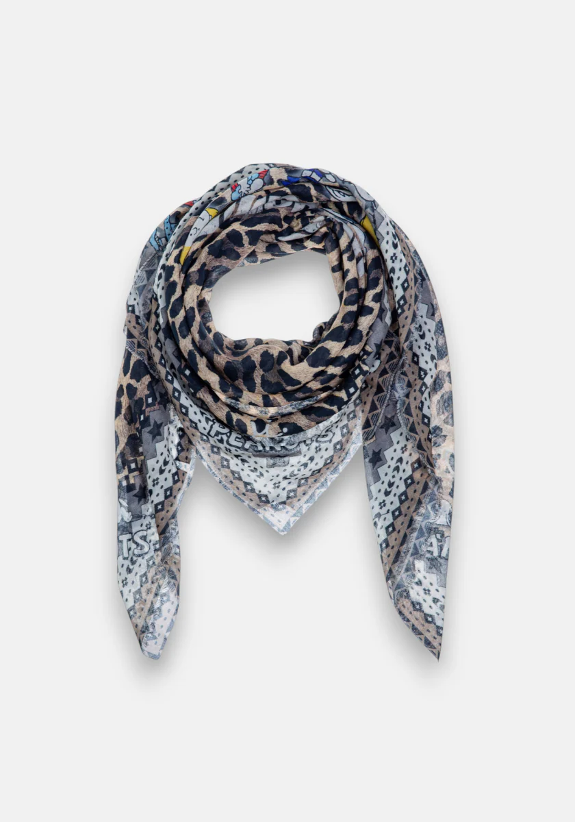 Skjerfet er laget med et heldekkende, glamourøst leopard- og peanuts-ttrykk.