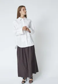 Den har krage, lange ermer med mansjetter, rett passform og lukkes med knapper foran.