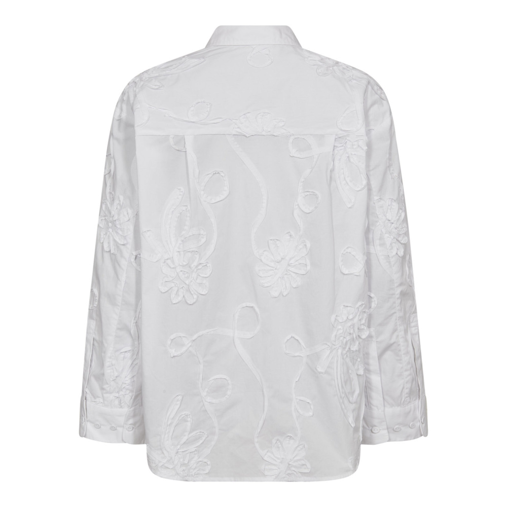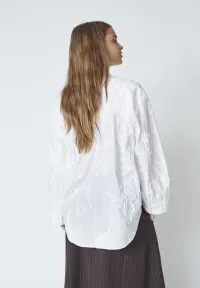 Skjorten har brodert blomstermønster som gir et sofistikert uttrykk.
