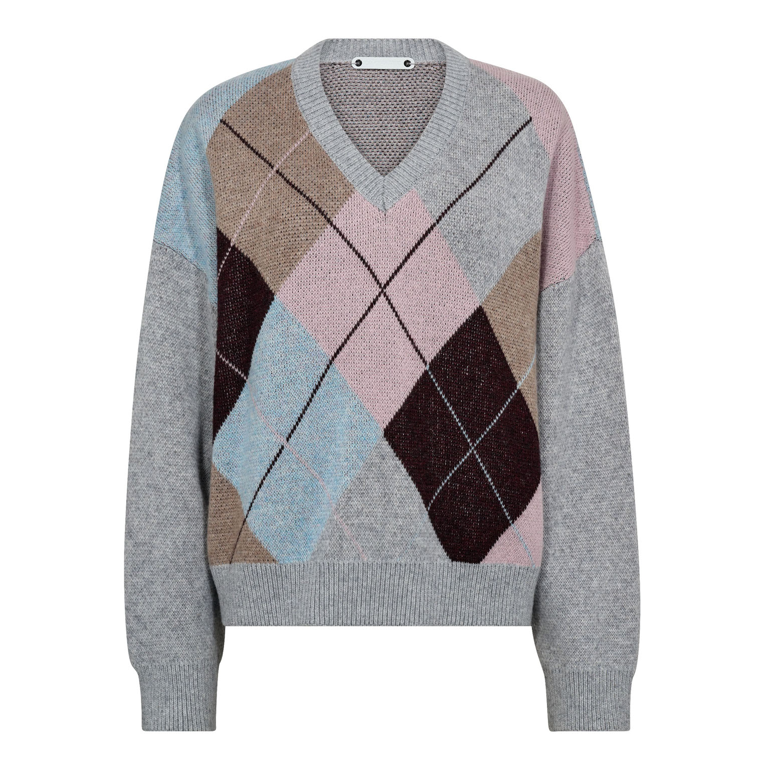 Nydelig strikkegenser med v-hals og argyle mønster.