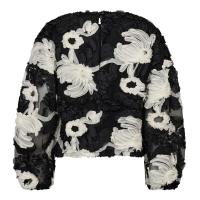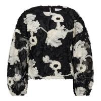Lekker bluse med mønstret stoff i sort og hvit med volanger og lange ermer. Blusen har glidelåslukning i ryggen.
