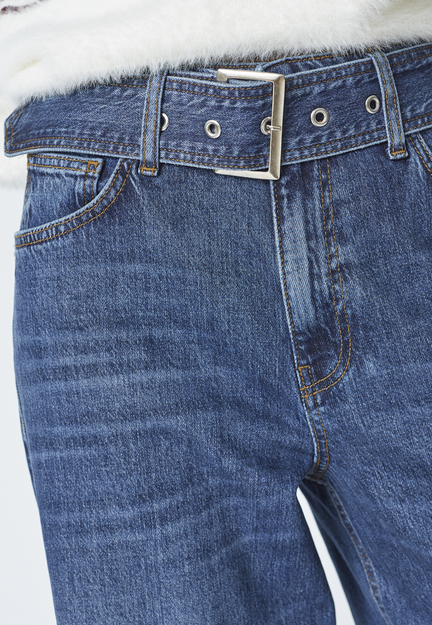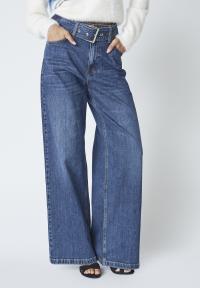 Råfin jeans med vidde, langebein, 5-lommers og belte.