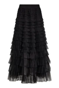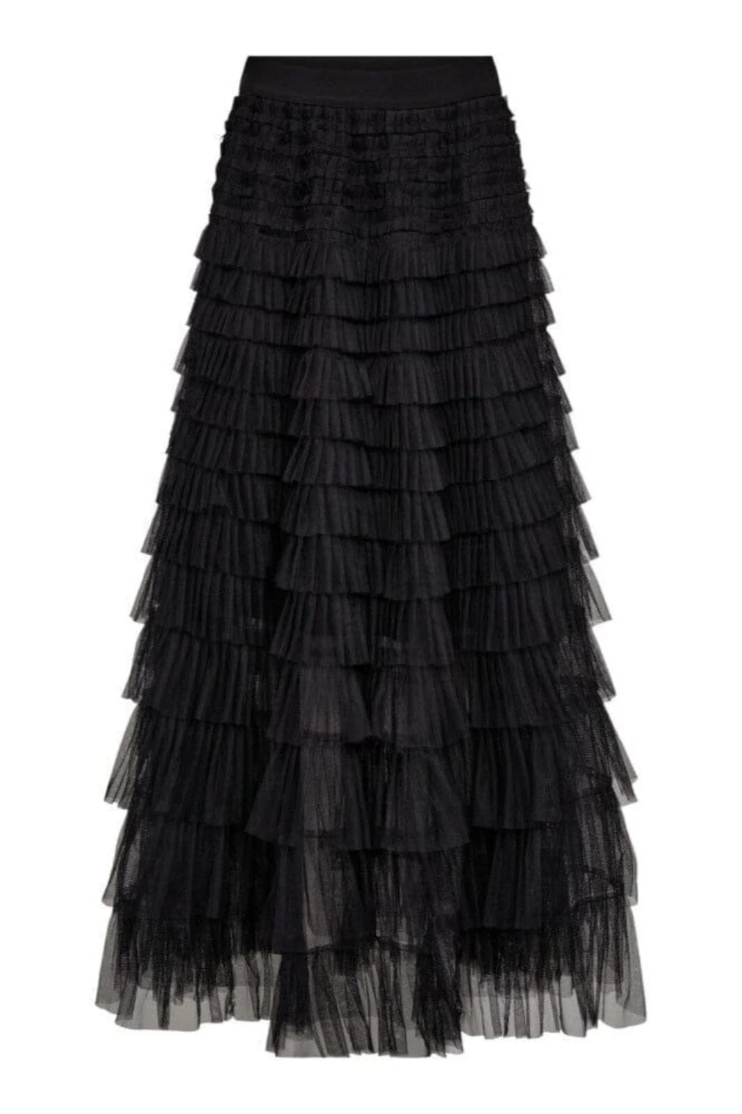 Svart fotsid skjørt fra Co'Couture med lag på lag av volanger. Skjørtet har en myk elastisk kant i midjen og et voluminøst design.