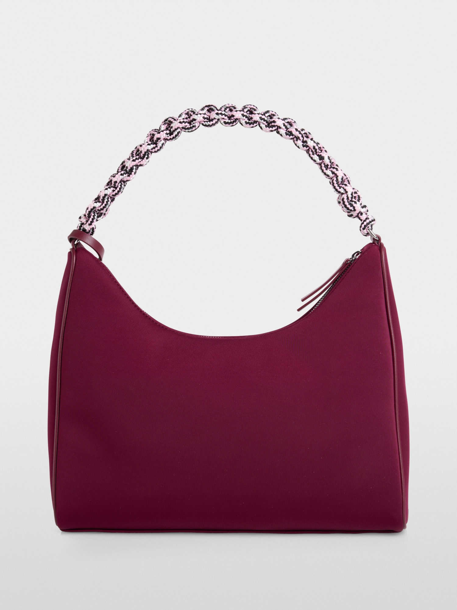Den har en påsydd lomme foran, glidelåser og et flettet håndtak.