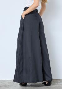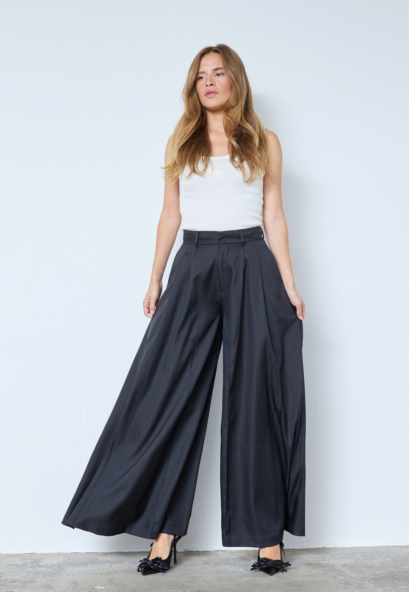 Buksen har høy midje, beltehemper i linningen, vide ben med full lengde.
