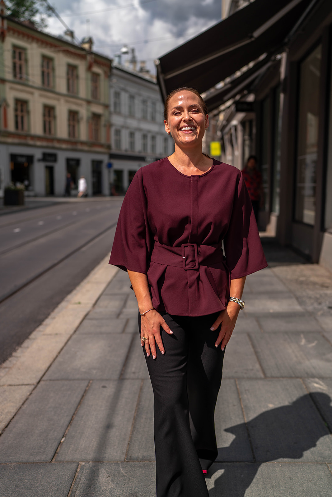 Lekker jakke topp med armlengde til albuen, skjulte trykknapper i front og belte i midjen.