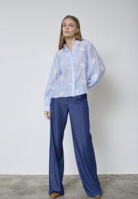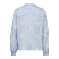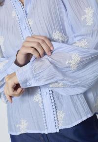 Lekker lyseblå skjorte i delikat rynket stoff med hvite broderier.