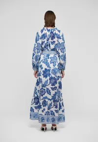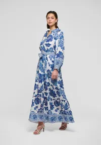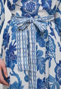 Overdimensjonerte eksotiske blå blomster er spredt over hele kjolen noe som skaper noe feminint og spesielt. Små rysjer sirkler kragen, og et knytebelte trekker den vanlige kjolen inn i livet.