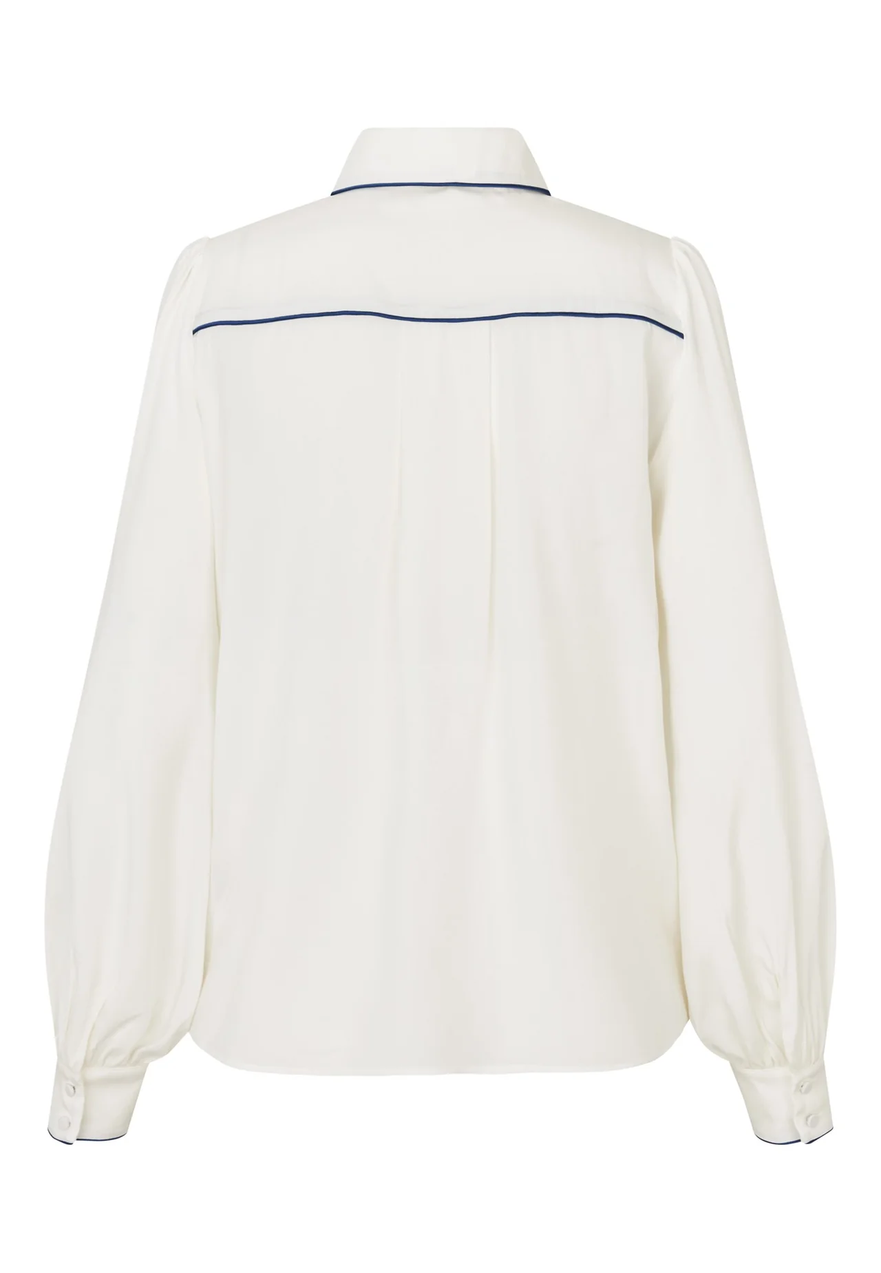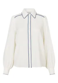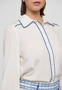 Et elegant blått kantbånd går rundt kragen, over skulderen og nedover fronten på denne elegante off-white silkeskjorten, noe som skaper en grafisk, moderne vri på et klassisk plagg.