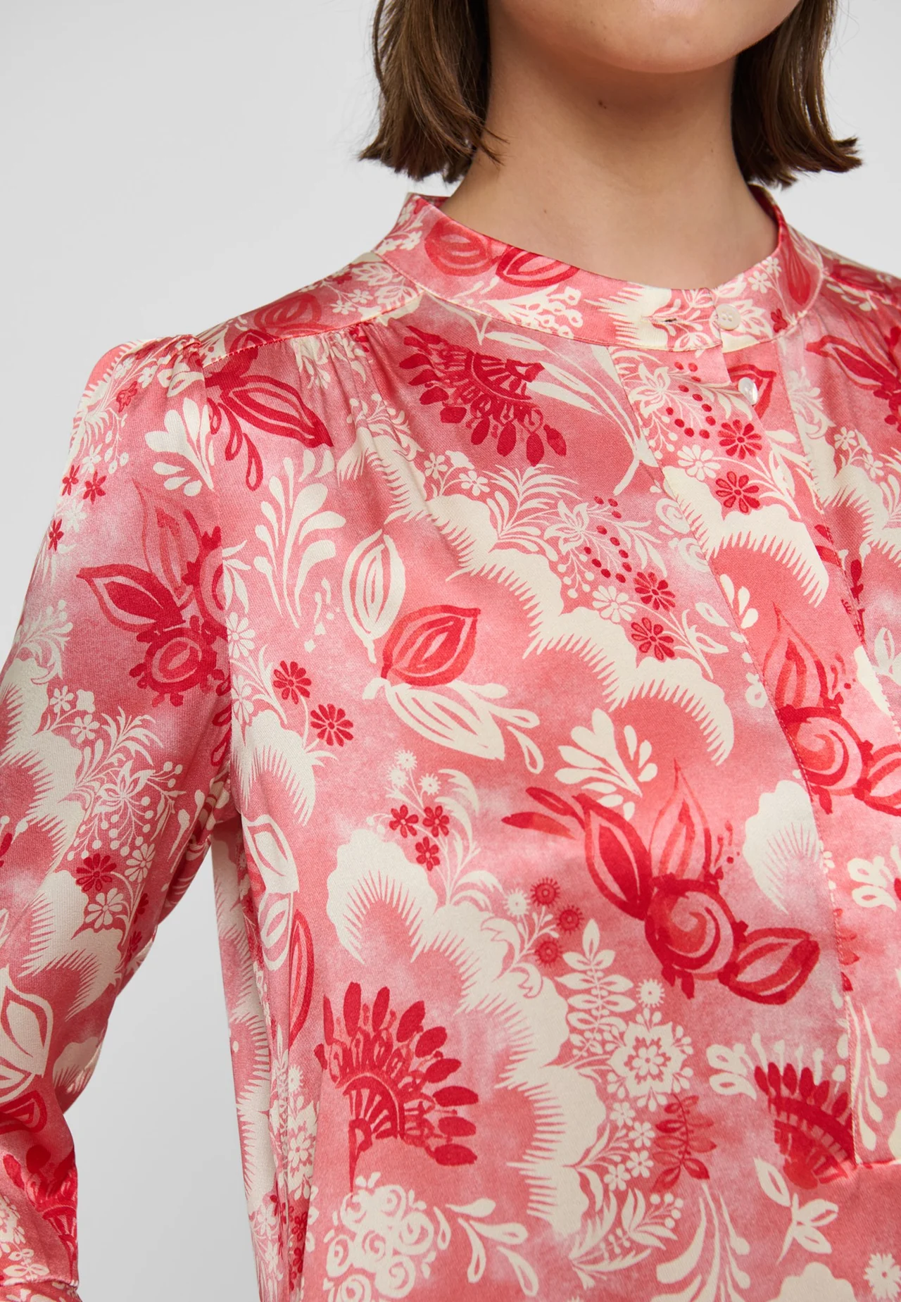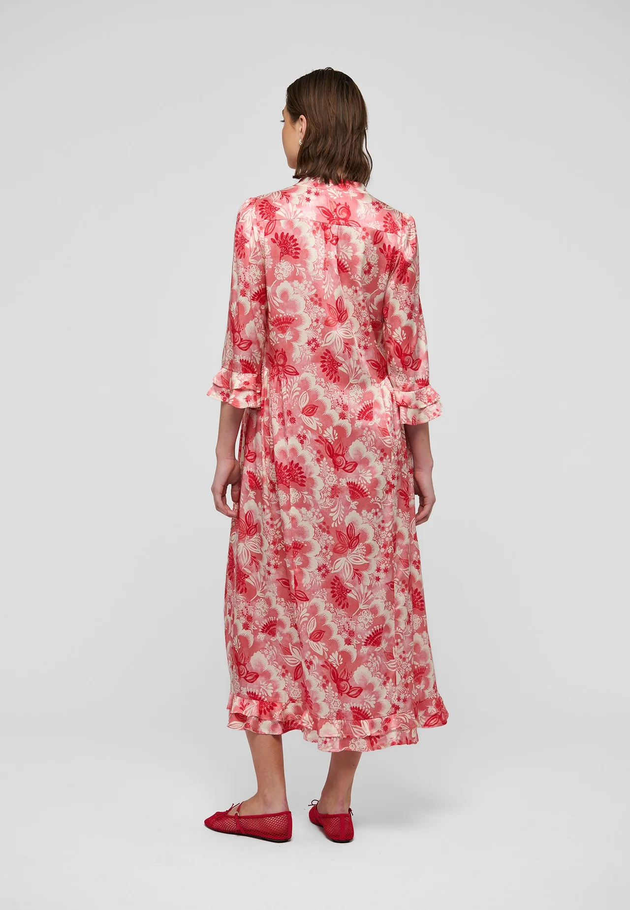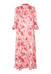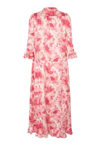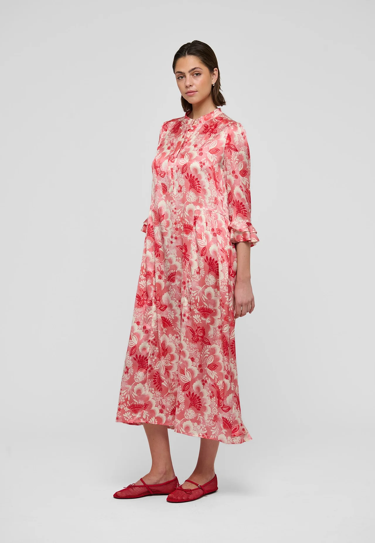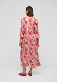 Et dristig rødt blomstertrykk gir denne ankel-lange kjolen med 3/4-ermer en ekte tilstedeværelse –