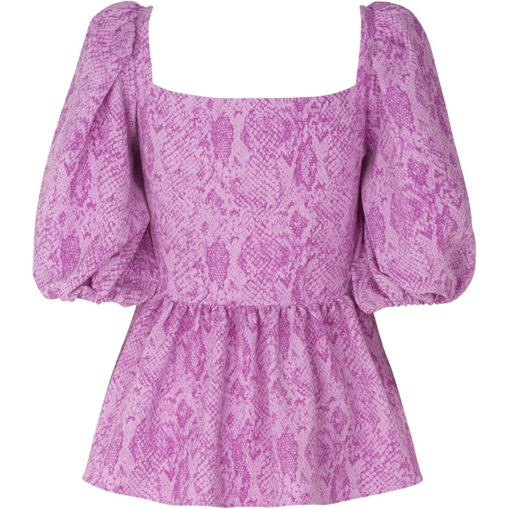 Lekker topp med puffermer og fin utringning. Den har rynker ut fra livet.