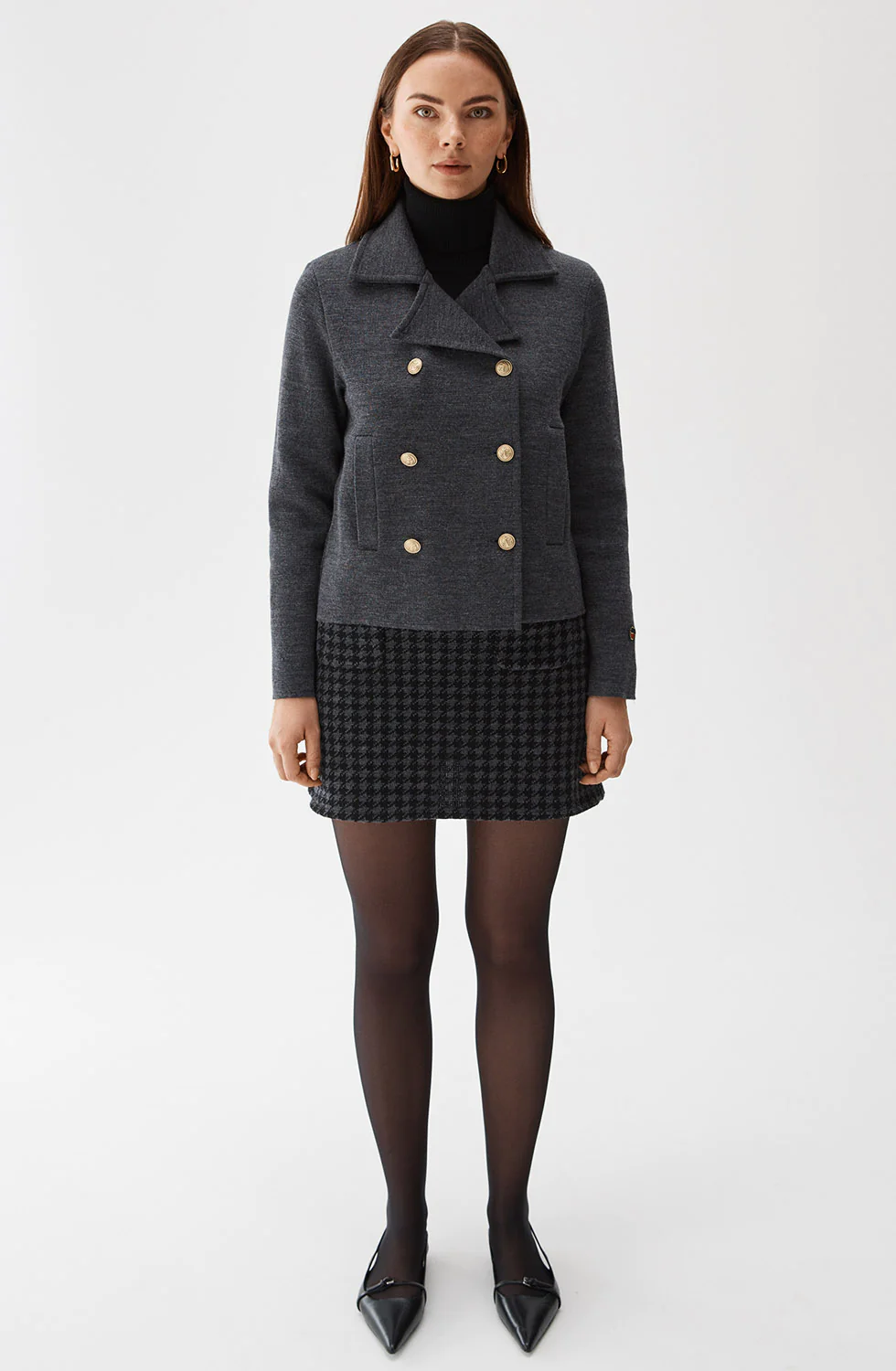 Dobbeltspente knapper i front, stikklommer i sidene og krage.