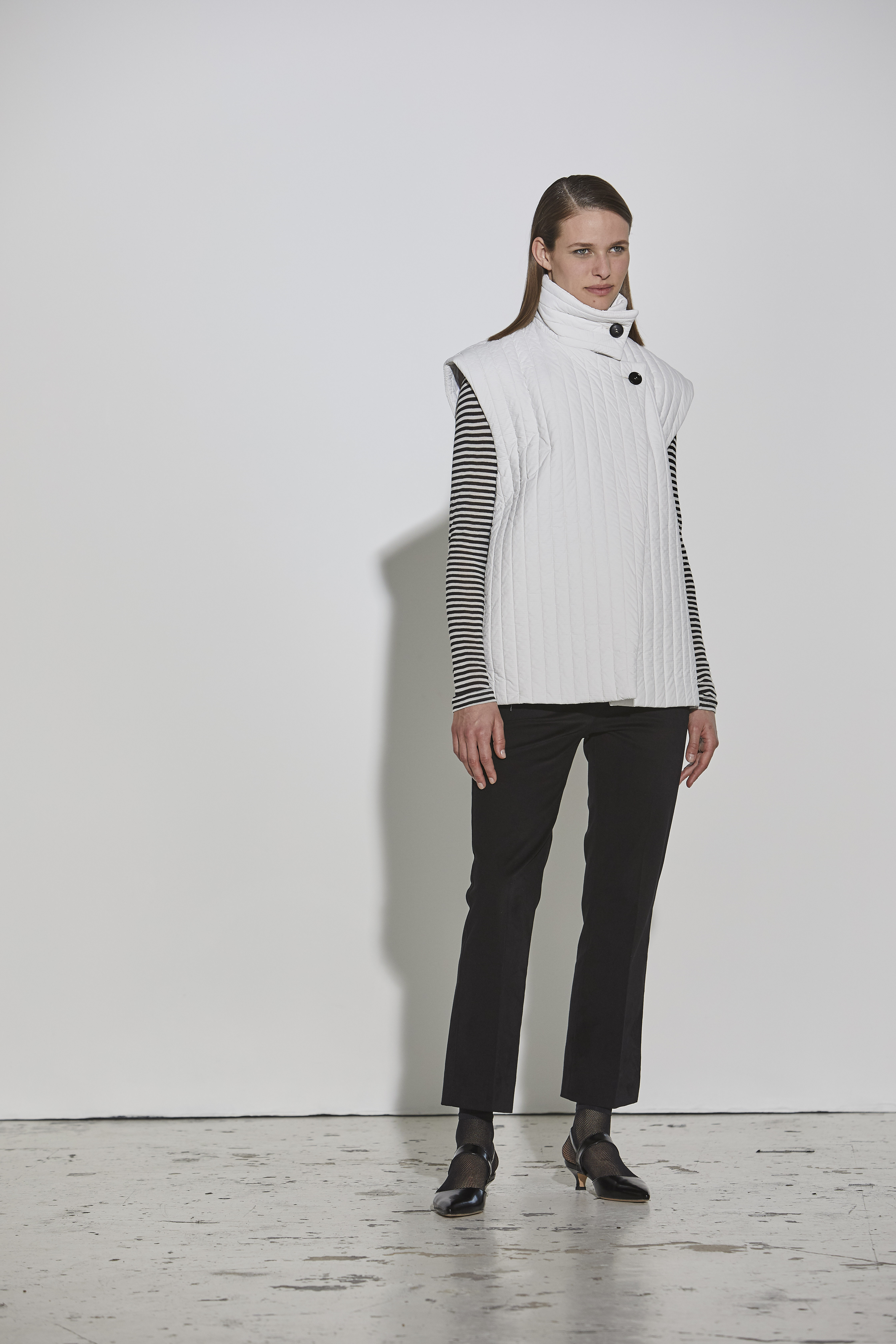 Råtøff polstret vest med høy krage, enkel en-knapps lukking og sidelommer.