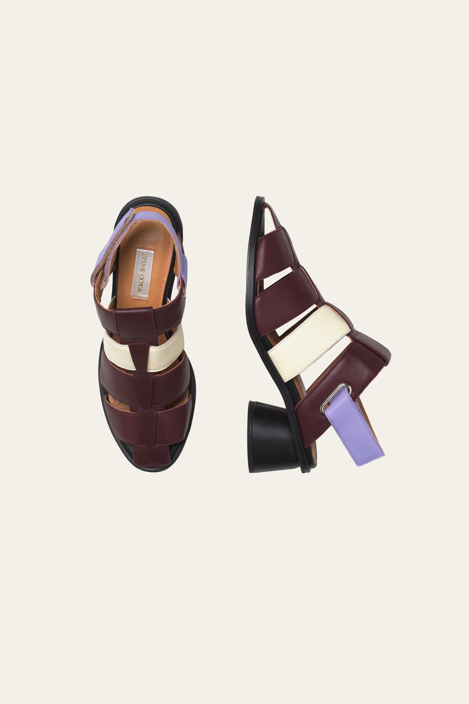 Lekre høyhælte skinnsandaler med fargeblokkert stroppedesign, sirkulær hæl og borrelås på siden.