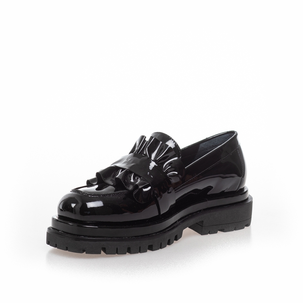 Loafer sko i sort lakert skinn. Skoen former seg godt etter foten og har en veldig god passform