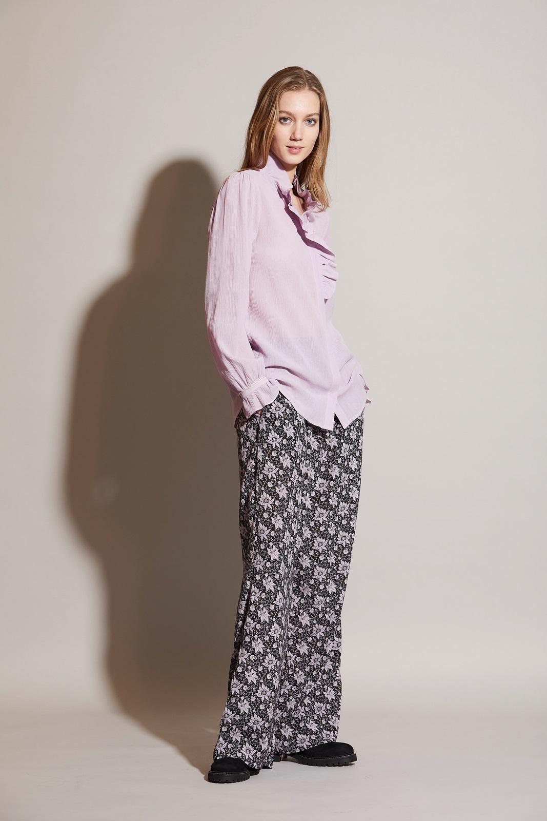 Figursydd skjorte med lange ermer, Skjult knappestolpe foran, volanger ved mansjetter og i front.