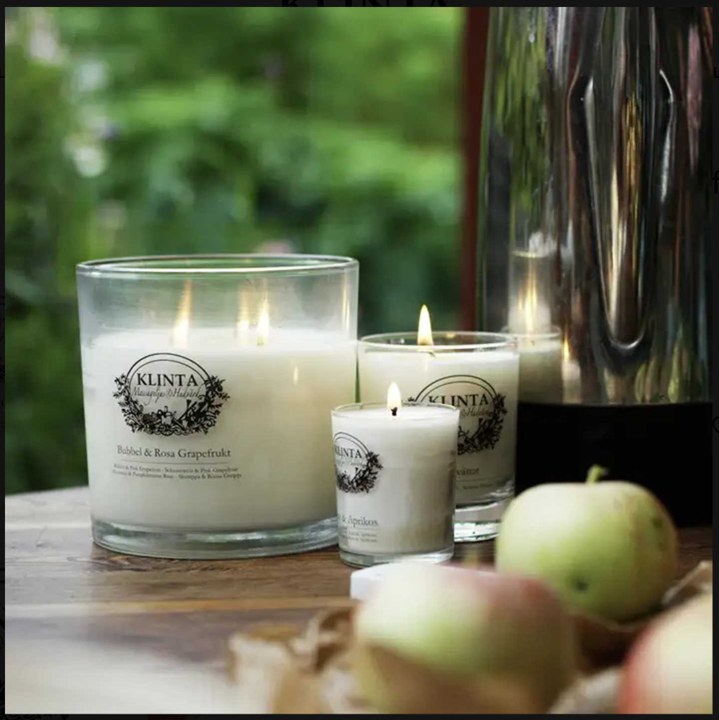 Denne spesielle størrelsen brenner i 80 timer og inneholder de samme ingrediensene som alle Klintas lys, nemlig raps, soya, kokos og parfyme eller eterisk olje. Ingenting annet*