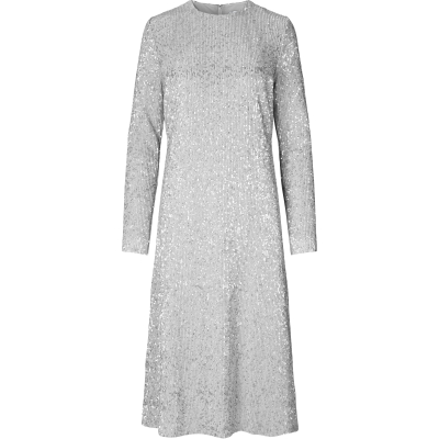 Celsia kjole i sølv. Løstsittende mellomlang kjole med slanke lange ermer. Kjolen har et luksuriøst metallisk paljettmateriale og med rund hals.
