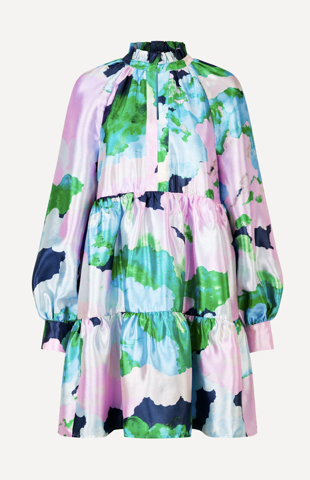 Jasmine Dress fra Stine Goya. Superfin kjole i skinnende stoff med flerfarget blomtermønster. Kinakrage med rysjekant som kan lukkes med en hempe i halsen. Ledig modell med kapper i skjørtet og lange ballongermer med mansjett. Stikklommer i sidene. Fôret.