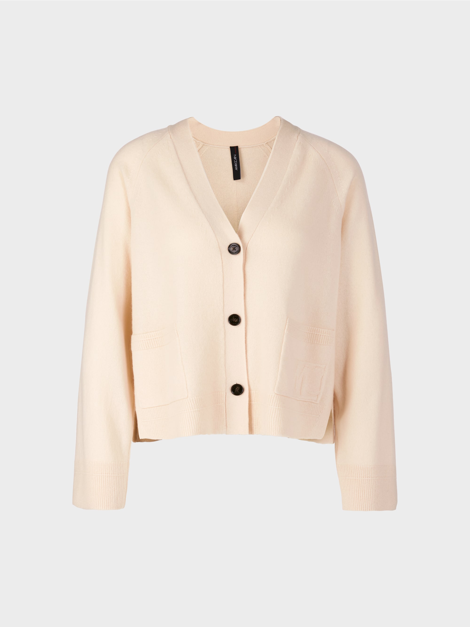 Lekker strikket jakke med raglan-ermer og knappestolpe. Cardiganen er laget av ull med kashmir av høy kvalitet. Den har to sidespalter og lapplommer, hvorav den ene er dekorert med en MC-logo. Jakken har V-hals og festes med tre knapper.