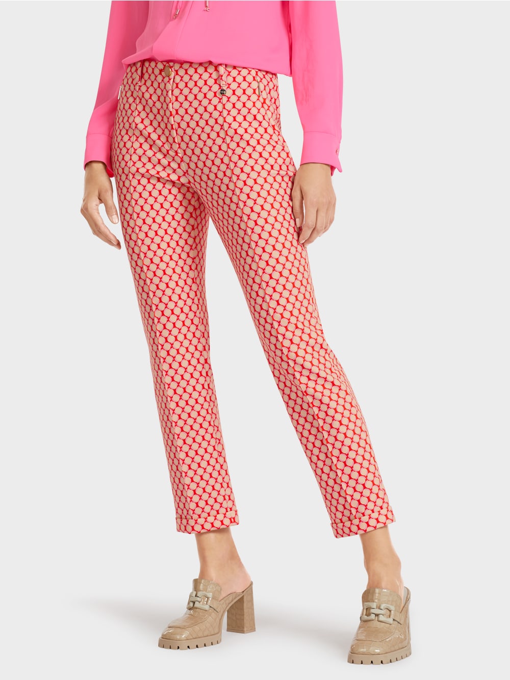Ankellange bukser i mykt stretchstoff. Disse buksene vil gi et flørtende utseende til ethvert antrekk med deres all-over prikkede mønster. De har lett avsmalnende ben med oppslått fald. Usynlige skrå sidelommer gir ekstra komfort.