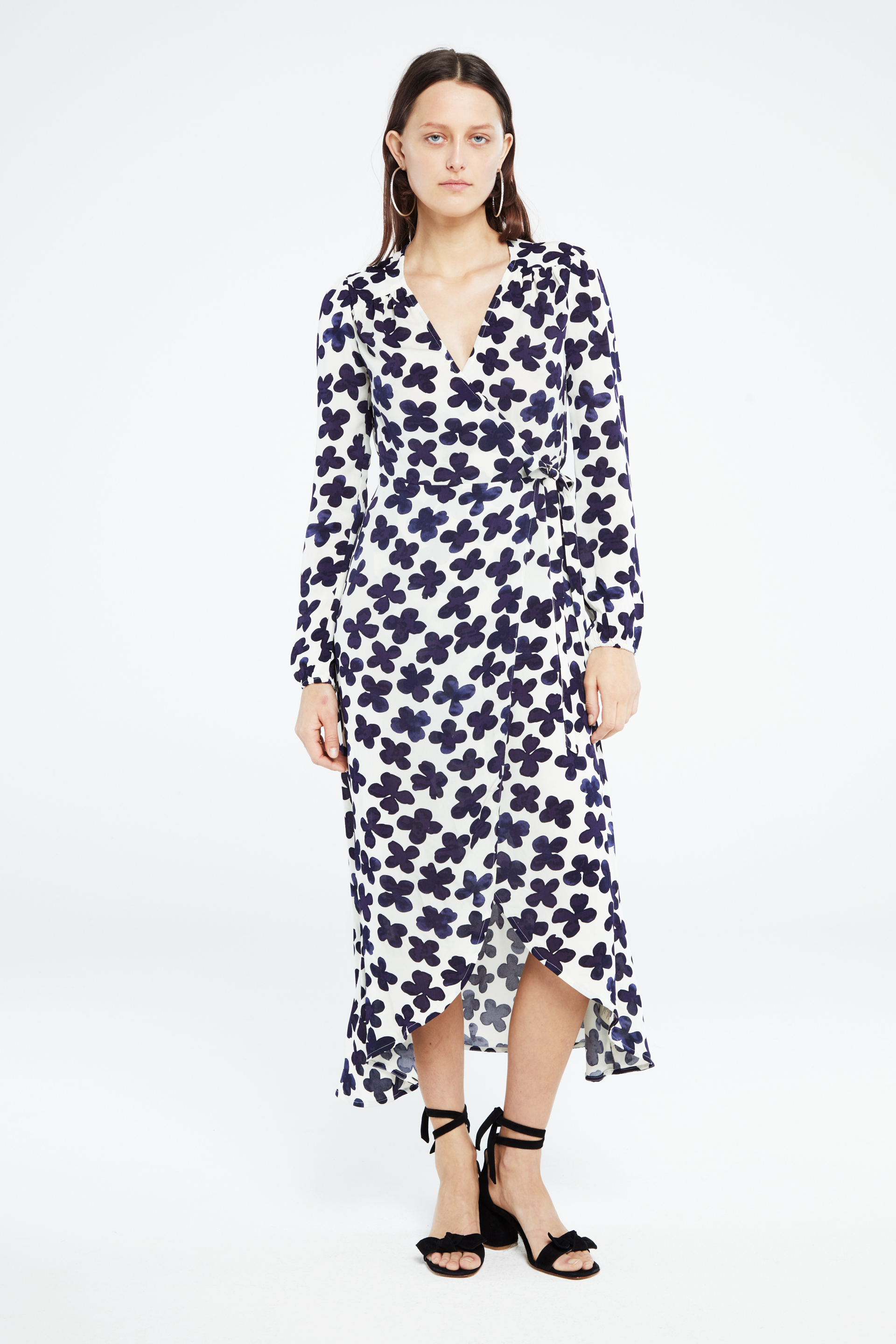 Natasja dress er en midi-omslagskjole med V-hals, fôr og lange ermer med elastiske mansjetter.