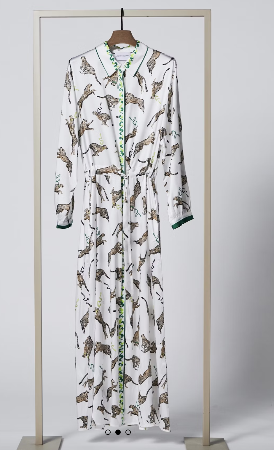 Lang nydelig silkekjole med skjortekrage og midjebelte med jaguar-print.