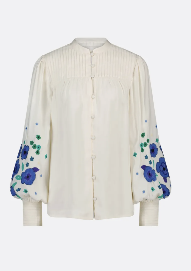 Flott bluse med voluminøse ballongermer og vakre broderte blomster.